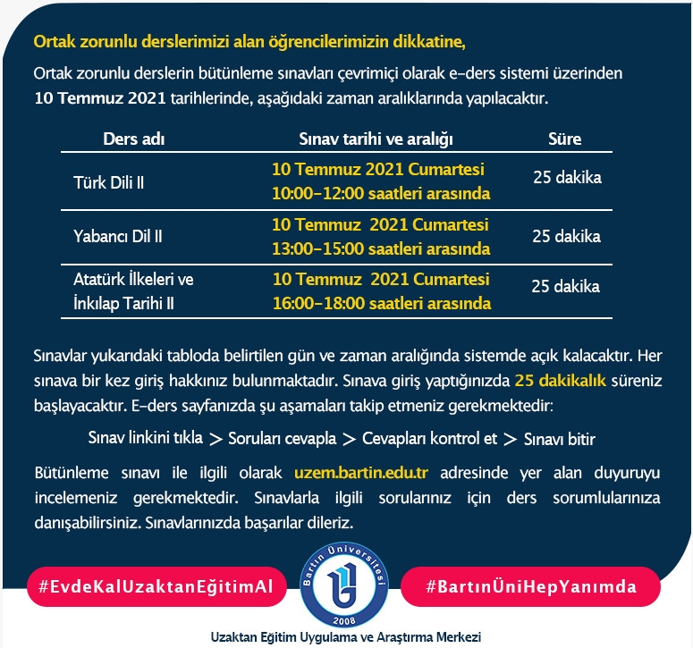 Ortak zorunlu derslerin bütünleme sınavları çevrimiçi olarak e-ders sistemi üzerinden 18. haftada 10 Temmuz 2021 tarihinde (her üç sınavda aynı gün yapılacaktır), aşağıdaki zaman aralıklarında yapılacaktır. Sınava e-ders (eders.bartin.edu.tr) sayfası giriş ekranında yer alan kırmızı butona (SINAVA GİRİŞ İÇİN TIKLAYINIZ) tıklayarak giriş yapmanız gerekmektedir. Bu butona tıkladığınızda sorumlu olduğunuz sınavlarınıza doğrudan ulaşabileceksiniz. Halihazırda var olan kullanıcı adı ve şifrelerinizi kullanabilirsiniz. Bazı derslerden muaf olan öğrencilerimiz (eğer UBYS'de muaf olarak gözüküyorsa) sınav sayfasında muaf olduğu derse ilişkin bir sınav görmesi durumunda, o ders ya da derslerden sorumlu değildir.